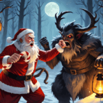 The snowstorm howled over the frozen expanse of the North Pole as Santa Claus stood tall, his crimson coat fluttering in the icy wind. Across from him, the hulking figure of Krampus loomed, his curved horns glistening with frost. This wasn’t about presents or naughty lists anymore—it was personal.