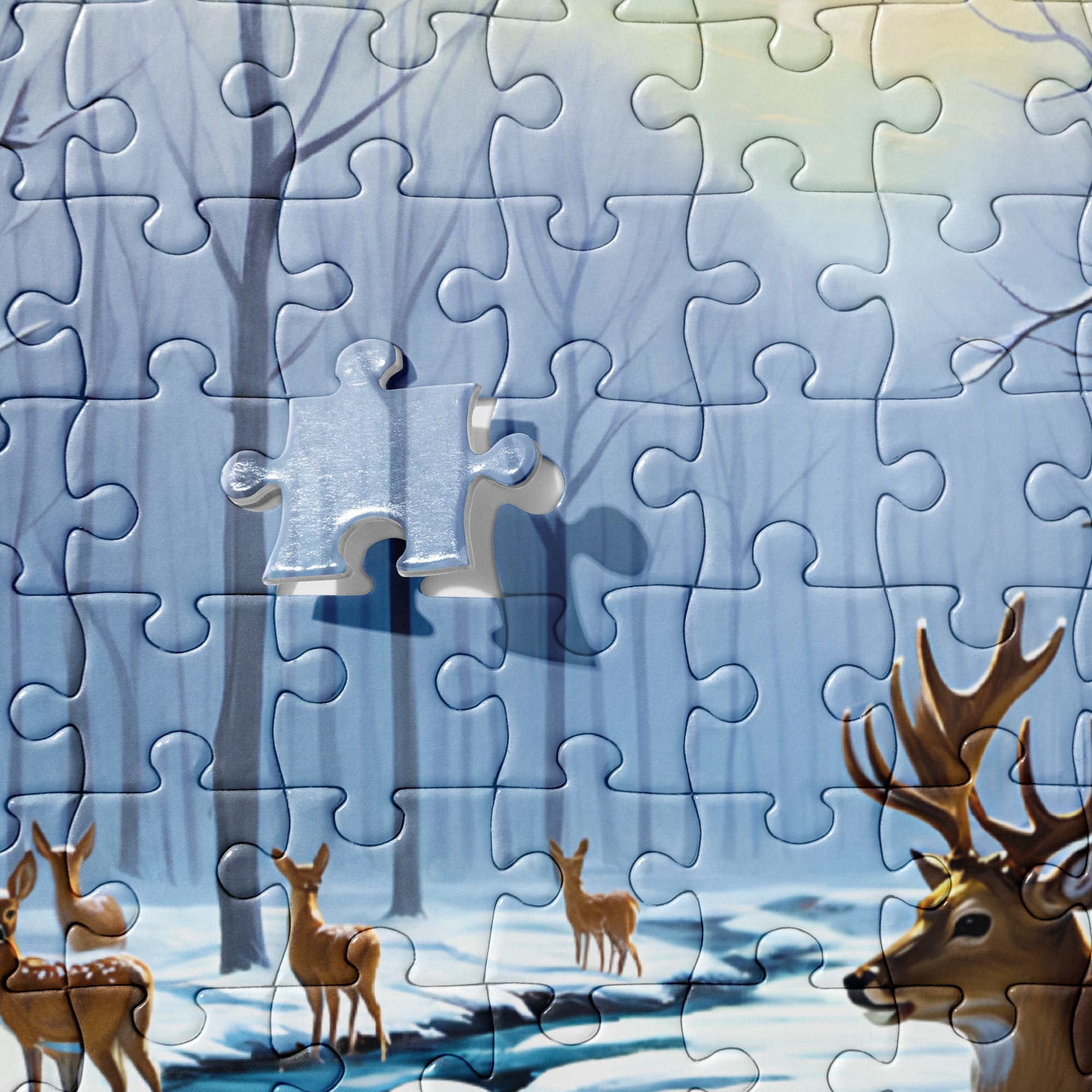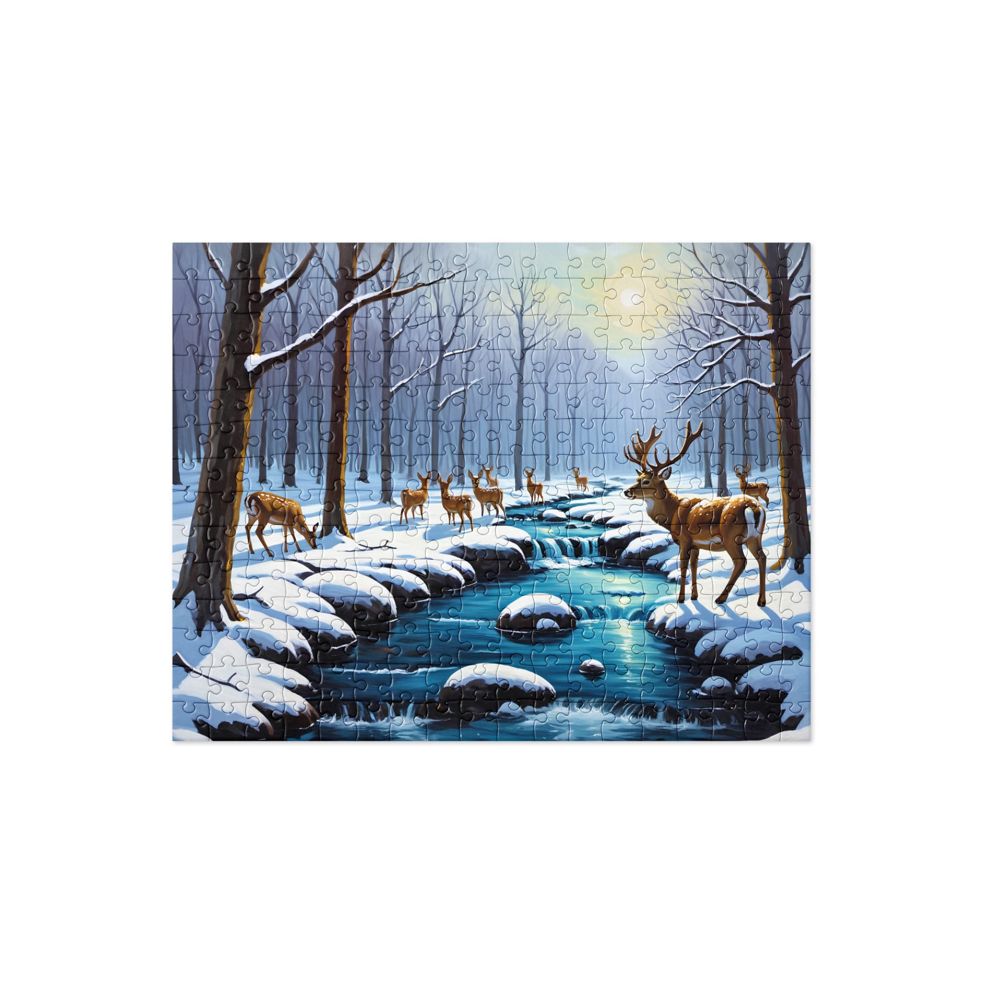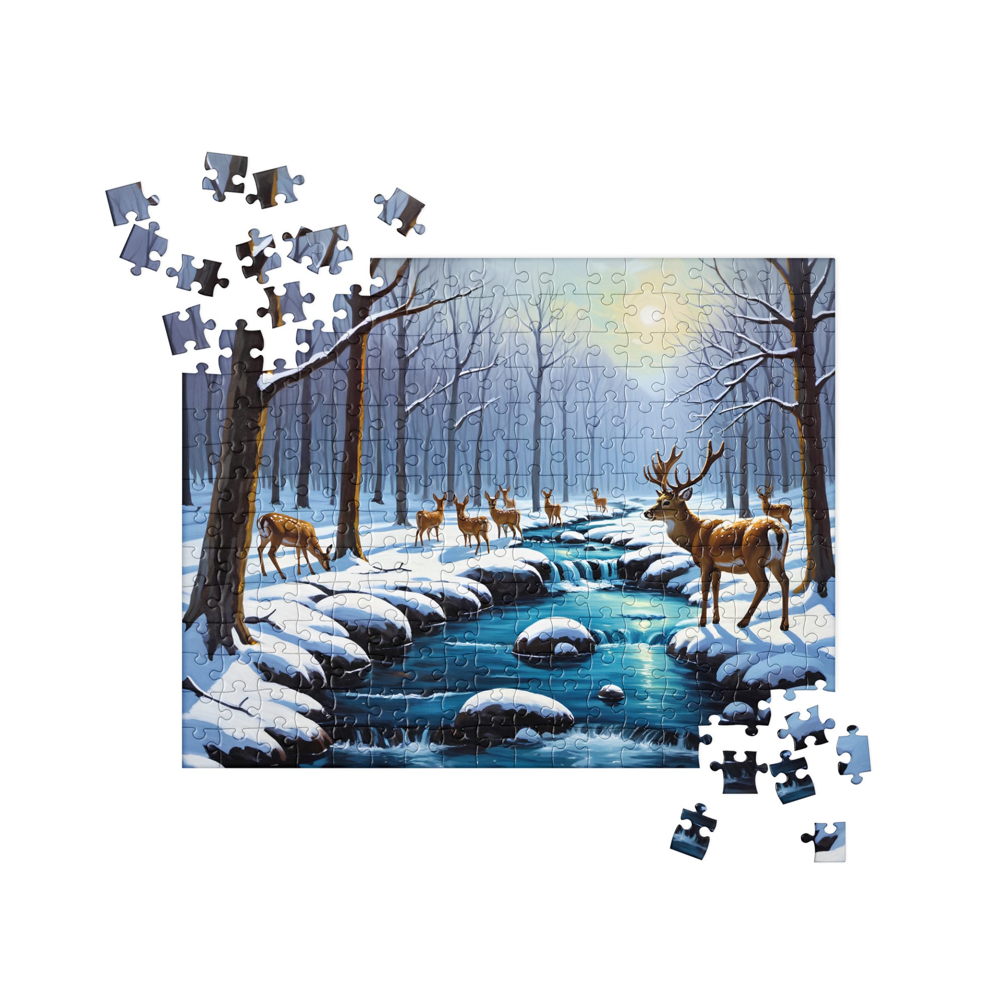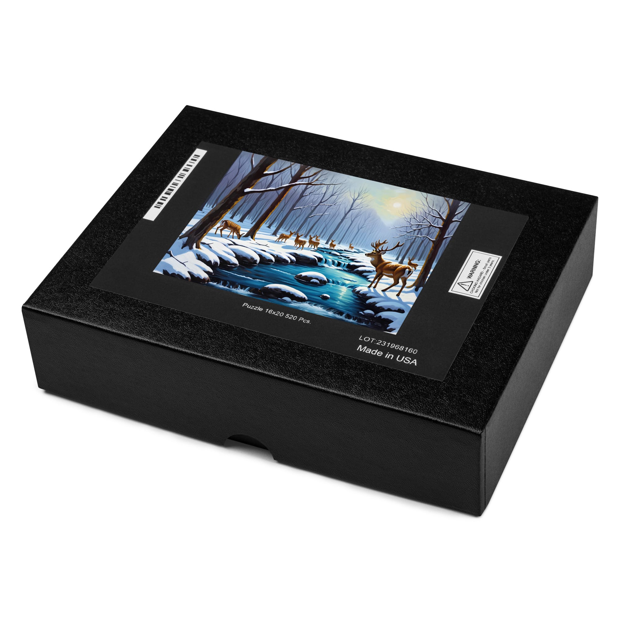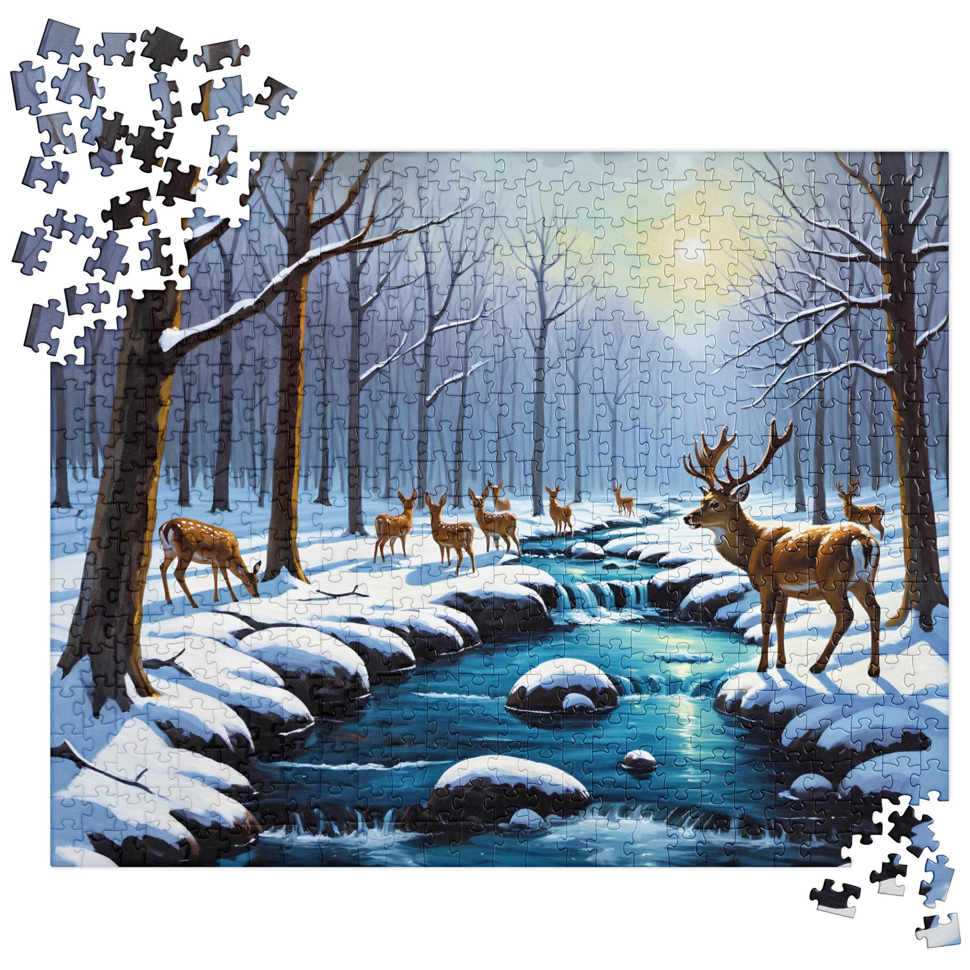 Piece together the tranquil beauty of winter with this enchanting winter puzzle featuring graceful deer gathering by a bubbling brook surrounded by a snow-covered forest bathed in soft sunlight. This winter scene jigsaw puzzle captures the serene magic of nature during the peaceful morning hours, creating a captivating challenge that brings the quiet beauty of a snowy woodland directly into your home. The detailed artwork showcases the gentle wildlife and pristine winter landscape that makes this season so magical and calming.